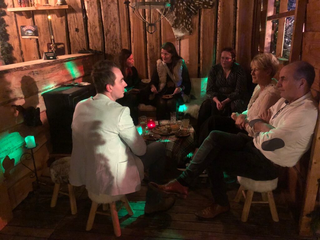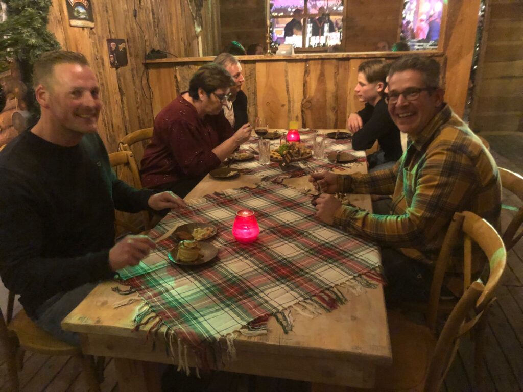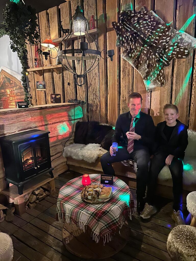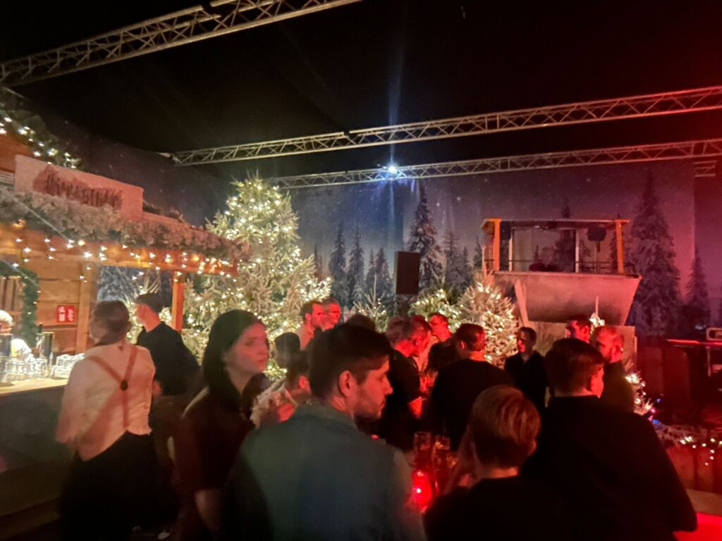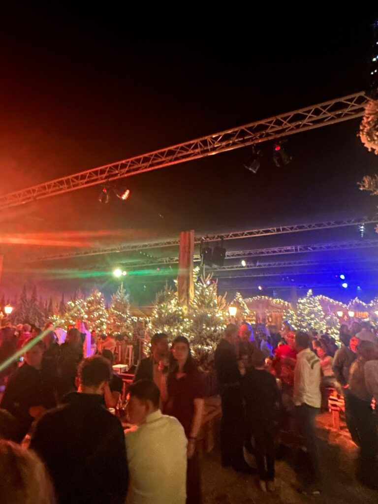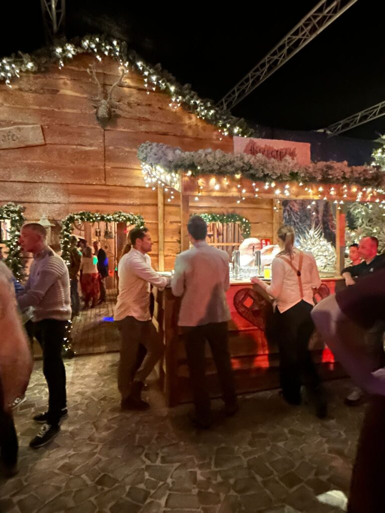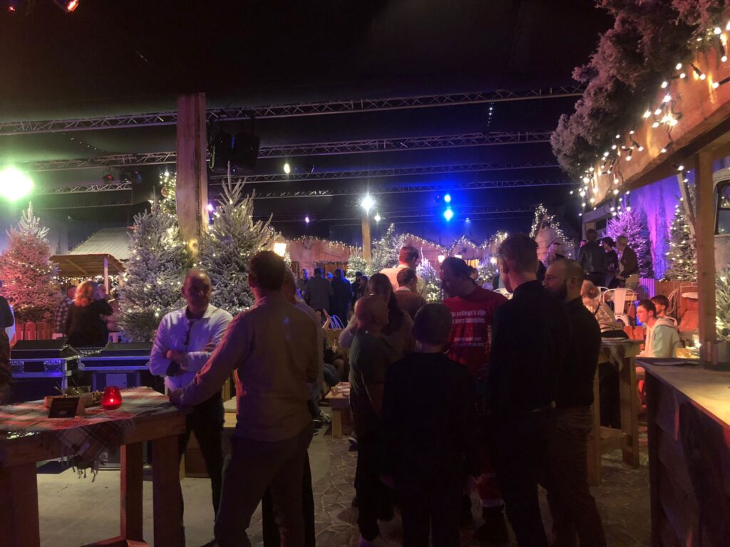 Bij aankomst werden we verwelkomt met glühwein en chocolademelk en naar onze plek gewezen om de avond voort te zetten in een sfeervolle winterse omgeving met kerstbomen, kerstman, sneeuw en houten huisjes.