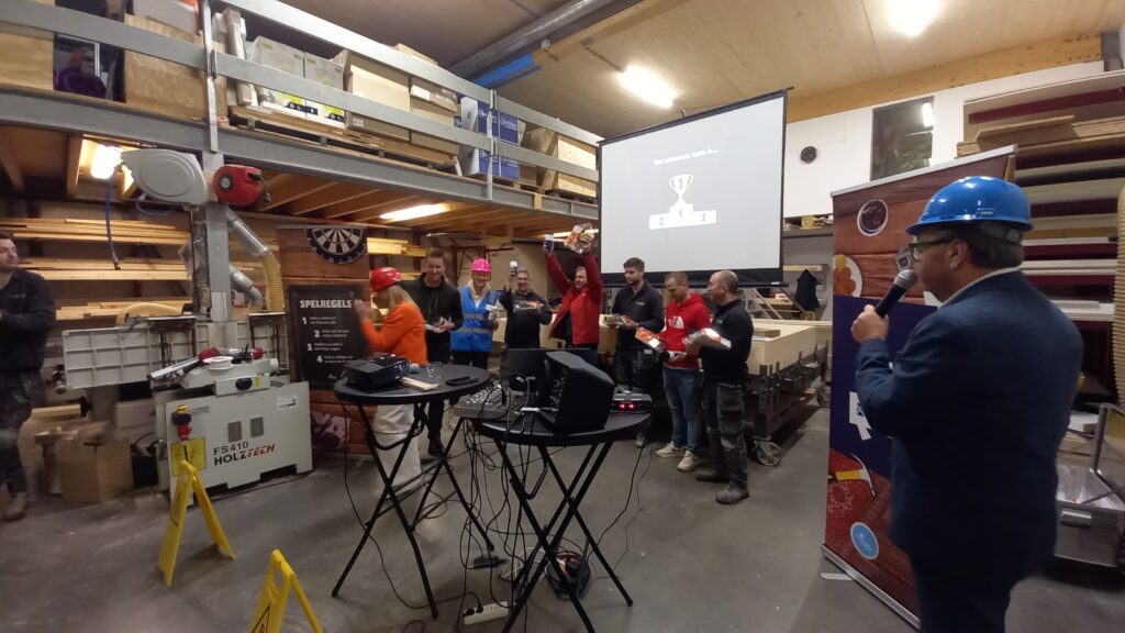 De winnende groep ‘de Kaasstengels’ gingen er vandoor met de prijzen: voor de mannen een handig pakketje met o.a. hoekwaterpas Bacho gipszaag en een rolmaat van 10M en voor de collega’s van kantoor een echte Gouden muis!