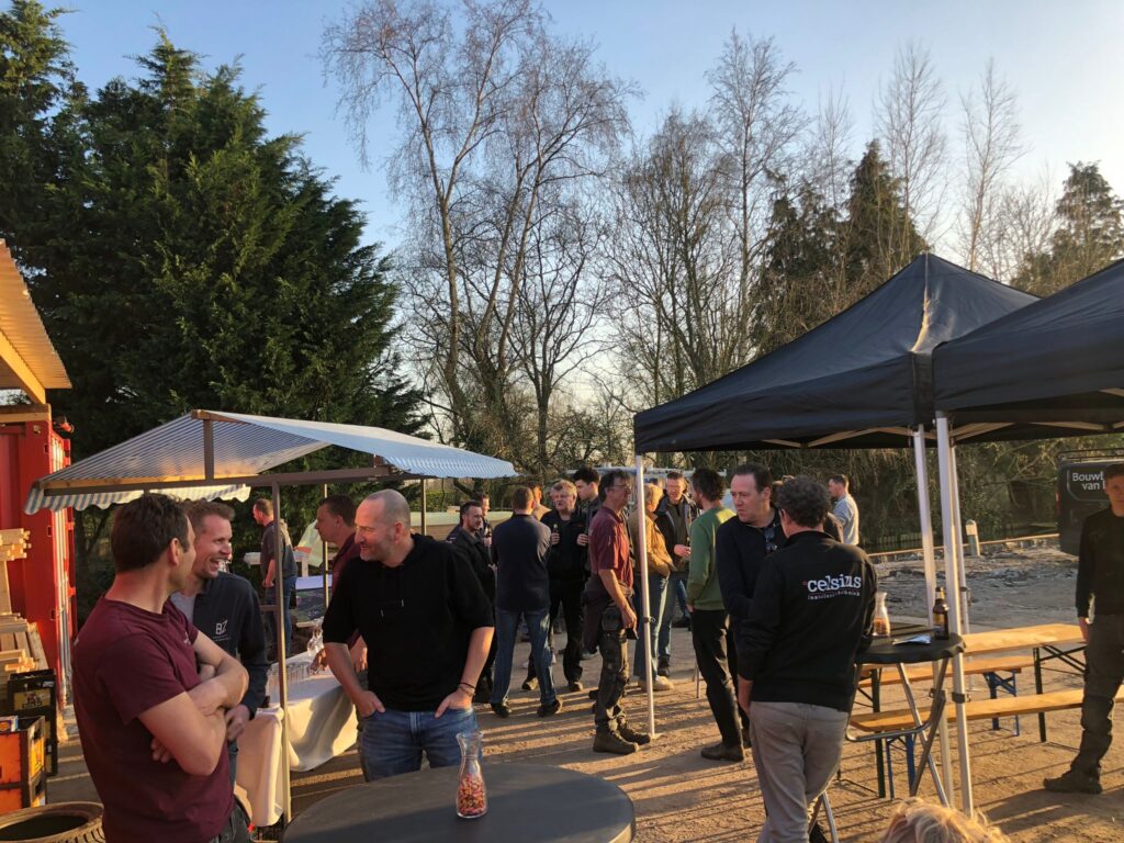 Voor deze heiborrel nodigde we de naaste buren uit de straat uit en de bedrijven op het industrieterrein. Samen met de BvE collega’s werden onder genot van hapje en drankje de nieuwe locatie en de plannen voor het nieuwe pand bekeken. Julian mocht zelf de heistelling bedienen en een paal erin slaan; dat ging hem prima af! Erg leuk dat er die middag zoveel belangstelling uit de buurt was; het mooie lente weer hielp hier ook vast aan mee. Jan van Sligtenhorst bij deze onze dank voor de prima verzorging!