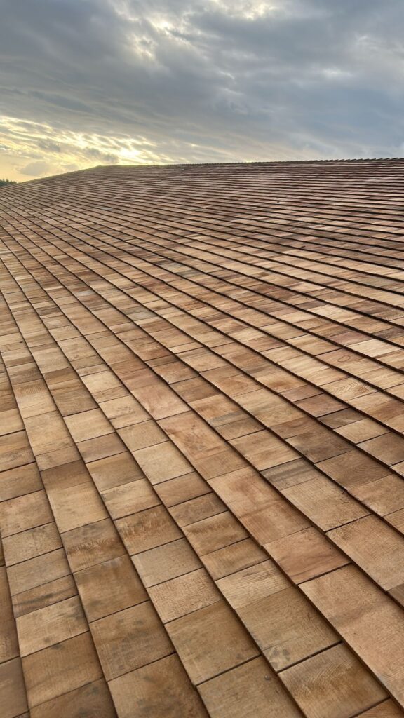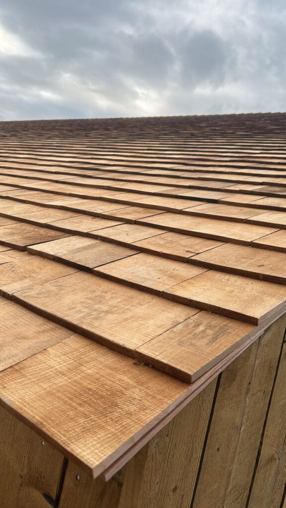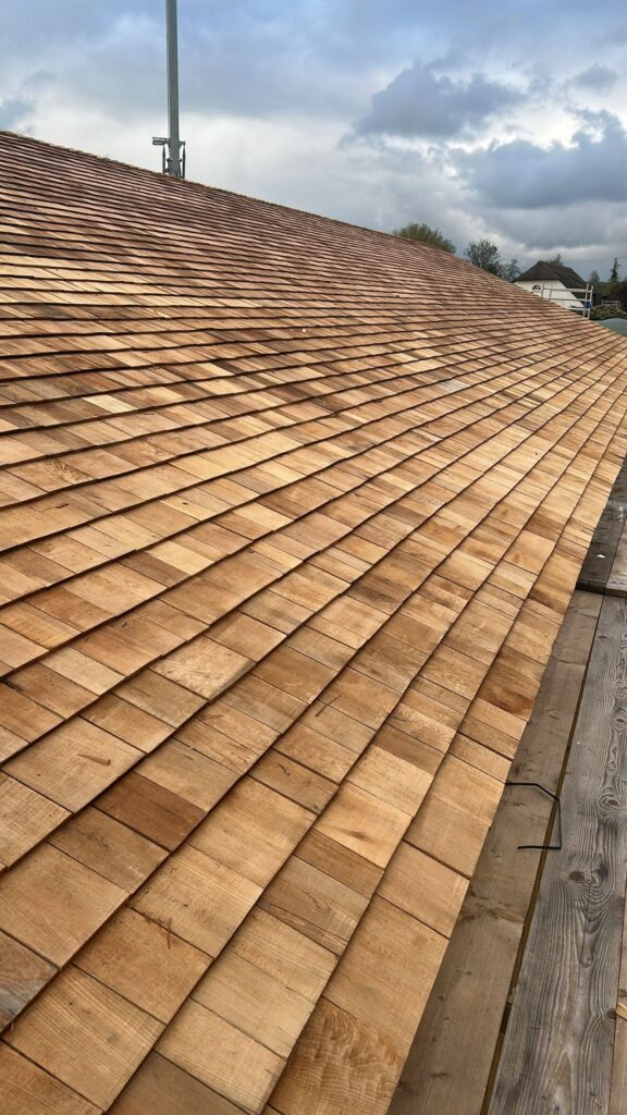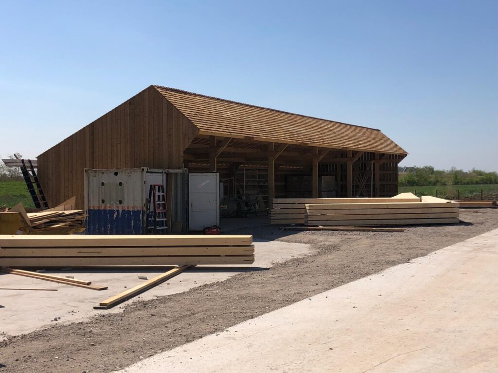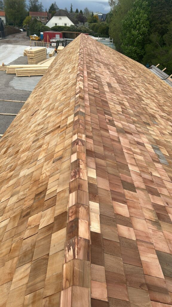 Het dak van de houten overkapping is deze week ook afgerond door Julian en Ernst. Samen hebben ze paar 1000 houten dakpannen bovenop genageld. Een flinke klus maar het resultaat mag er zeker wezen. Zelf zijn ze er trots op, nou wij ook heren!