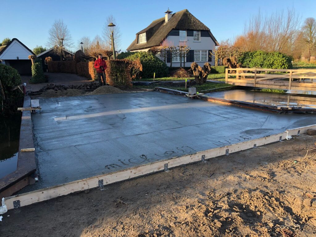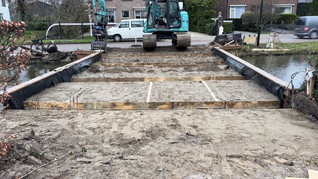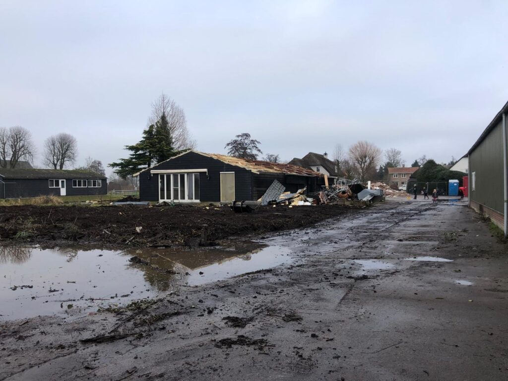 De aftrap op het nieuwe terrein vond afgelopen kerstvakantie plaats met het slopen van de oude toegangsbrug en vervanging door een bredere dam. Hierover kunnen straks de vrachtwagens goed het terrein op en hoeven dus niet meer langs de weg te lossen! Nu wordt er nieuwe beschoeiing geslagen en zijn alle bestaande gebouwen inmiddels zo goed als gesloopt. Volgende week zal dan de eerste heipaal de grond in gaan!
