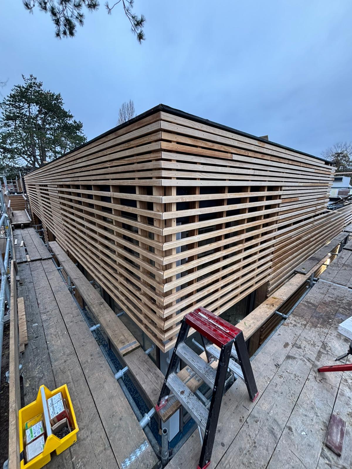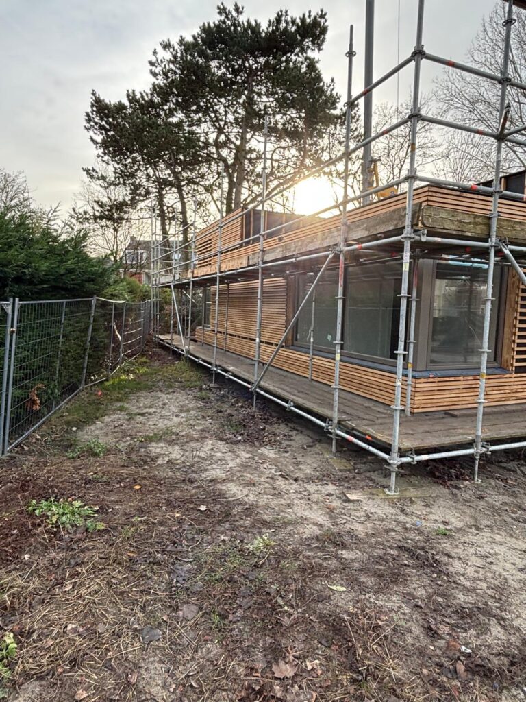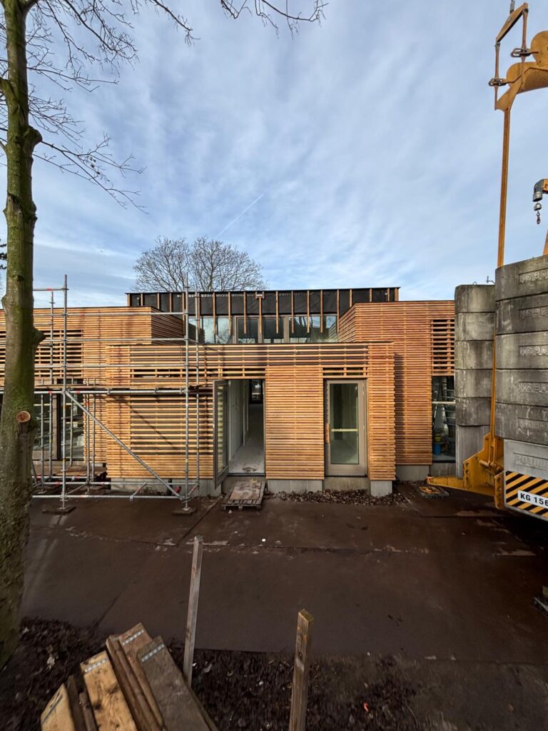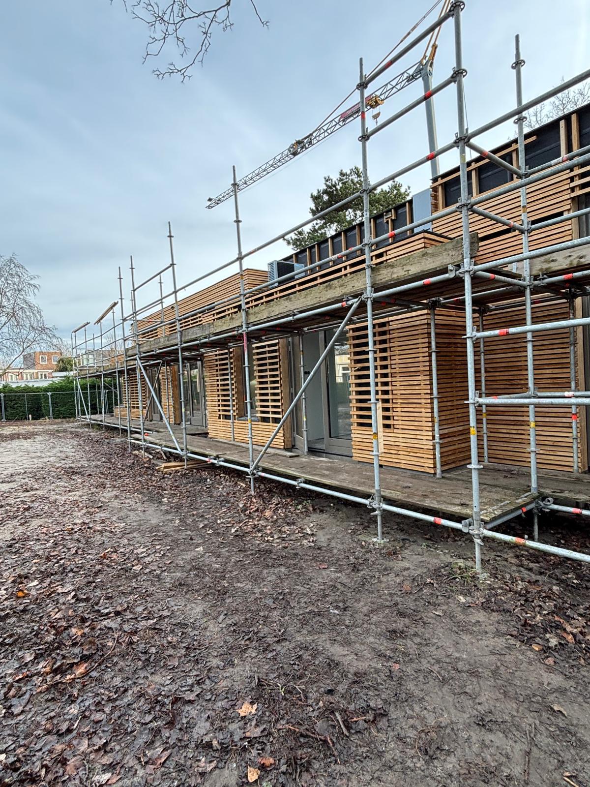Het casco wordt opgebouwd uit een houten damp-open constructie en wordt afgewerkt met een Accoya houten gevelbekleding en met Accoya houten kozijnen. Het platte dak wordt voorzien van een groen sedumdak.