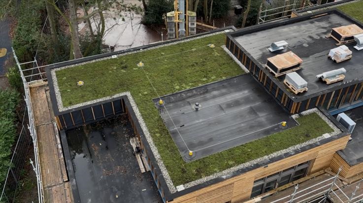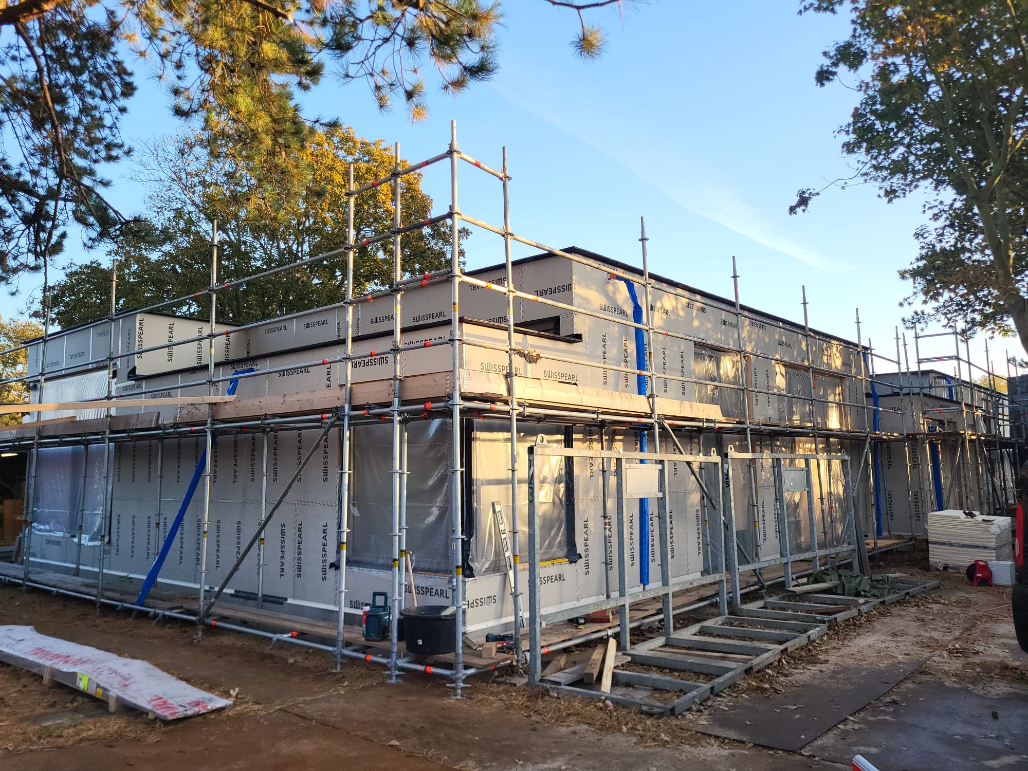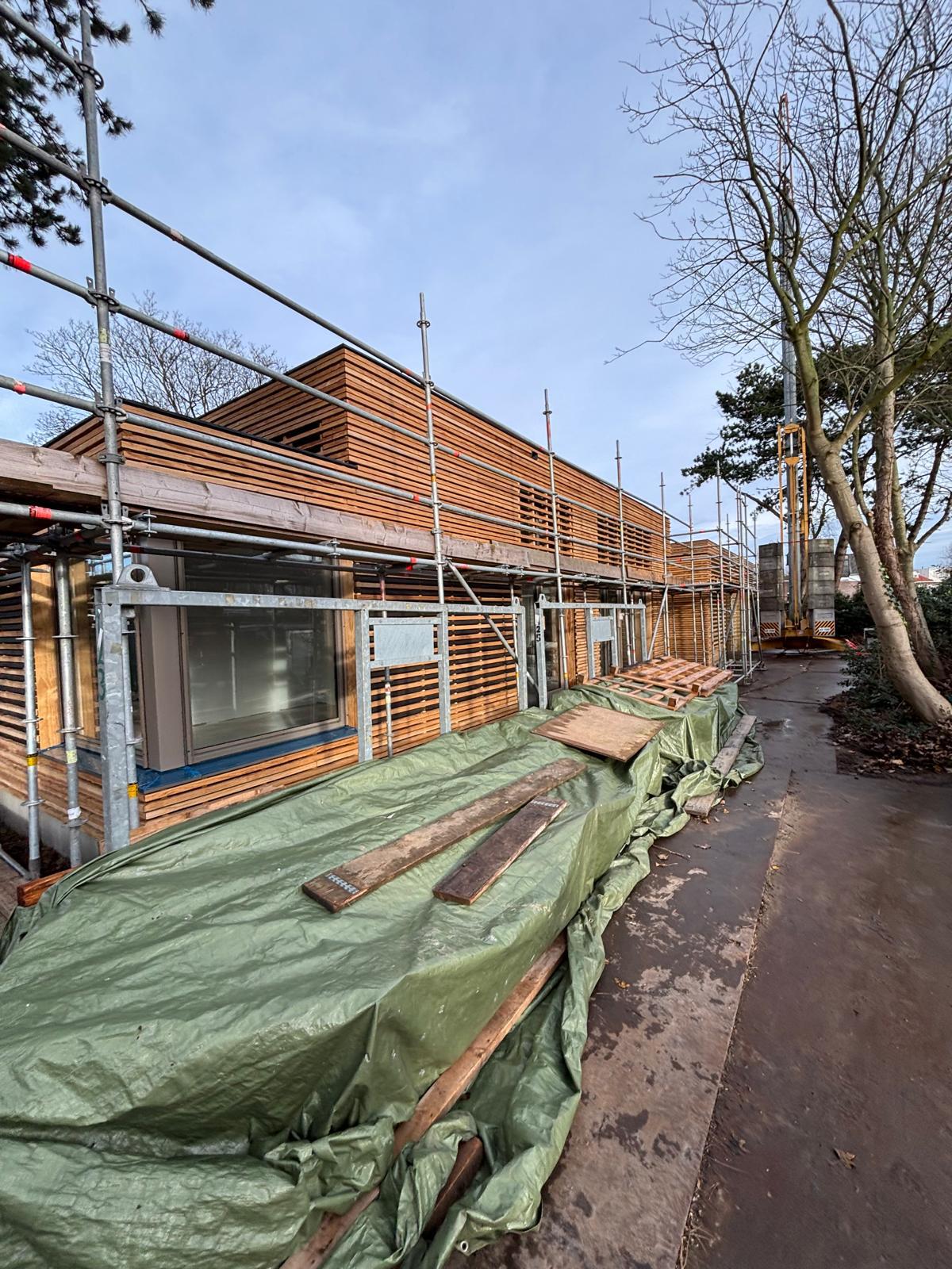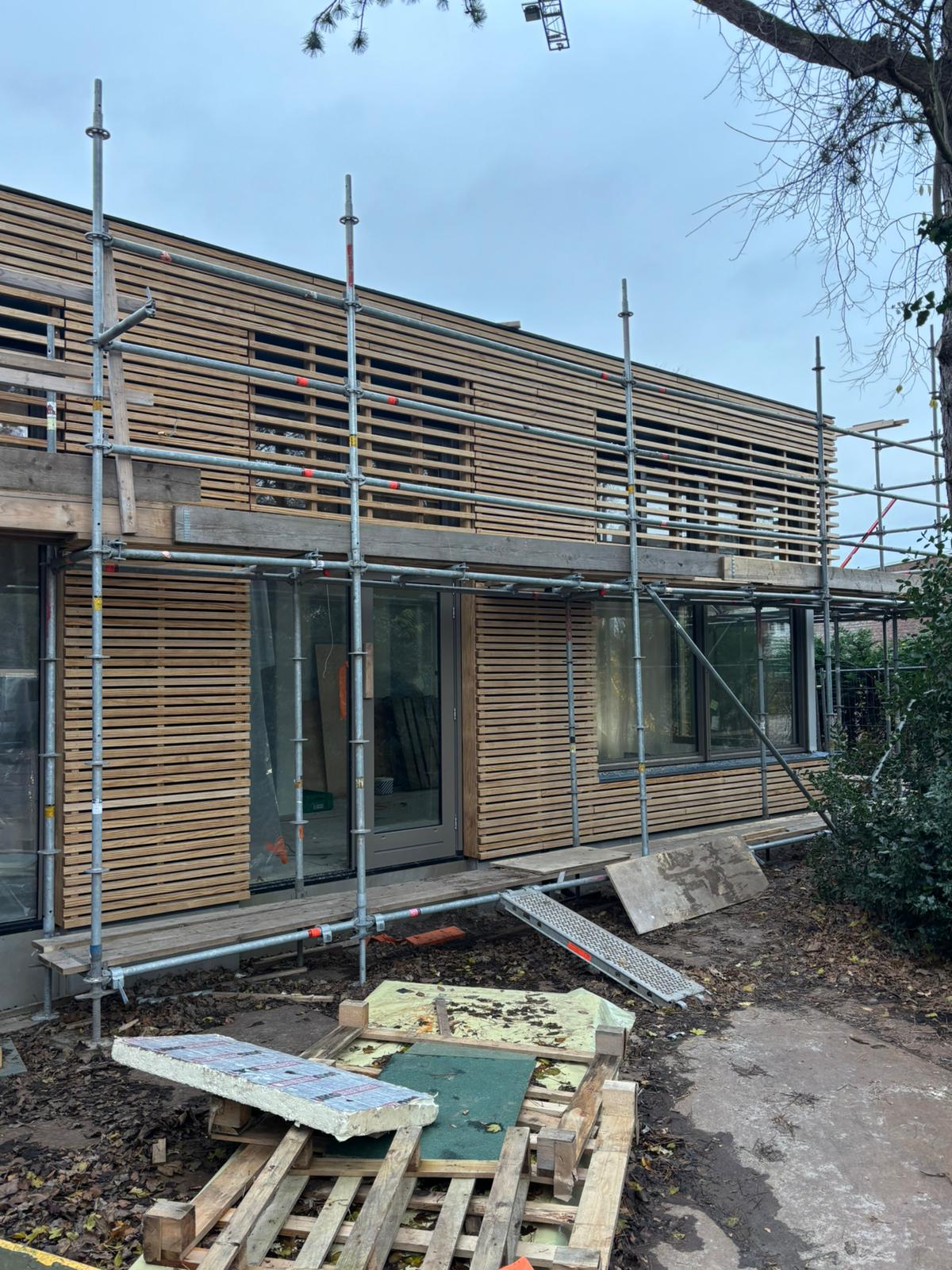 Het casco wordt opgebouwd uit een houten damp-open constructie en wordt afgewerkt met een Accoya houten gevelbekleding en met Accoya houten kozijnen. Het platte dak wordt voorzien van een groen sedumdak.